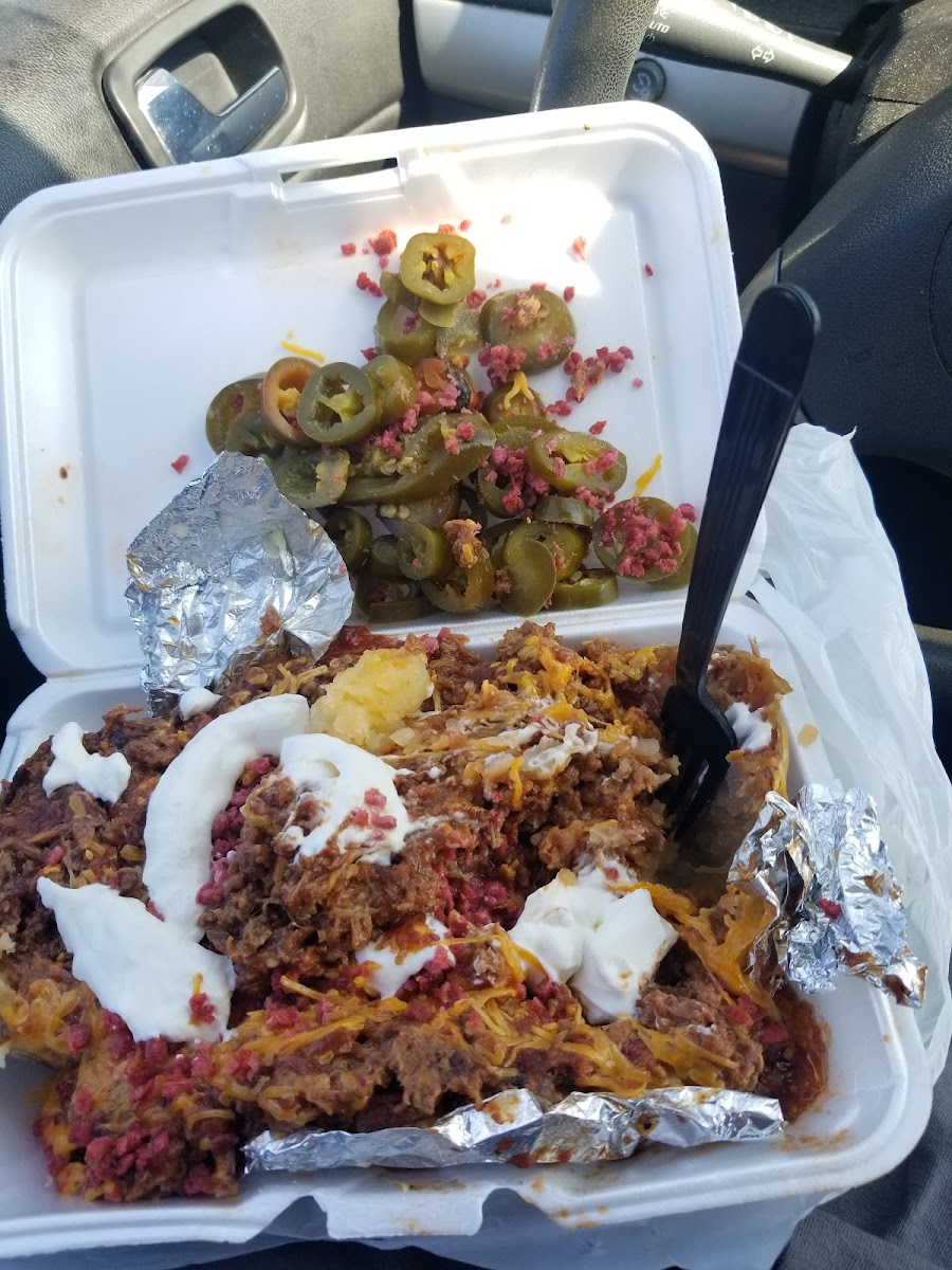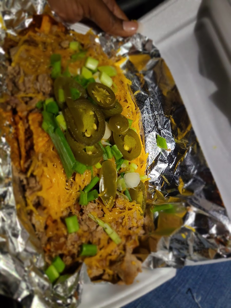 Having recently moved to the South Dallas area the closest bbq joint I would go to was Lockharts in Oak Cliff. Decided to try something in my immediate area and very happy I did. We got 2 of the 2 meat plates (See Pictures). Chopped beef and links and chopped beef and ribs. I was asked if I wanted my meats drowned in their bbq sauce to which I agreed but it is very saucy. So I will not be taking that into consideration with this review (will get sauce on the side next time.) Overall the meats were tender and juicy! My favorite thing though was their loaded baked potato! Highly recommend! Will definitely be coming back when I need my bbq fix!